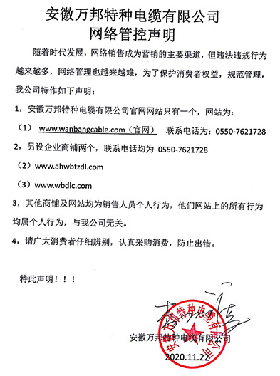 鄭重聲明:安徽萬邦特種電纜有限公司官方網站為:www_wanbangcable_com.lebemol.com,除此之外無任何子網站或合作網站,其余均為假冒偽劣。電話:0550-7621728 13485756353 地 址:安徽省天長市滁州高新技術產業開發區經四路29號